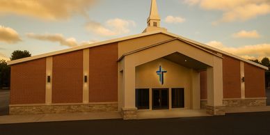 Canopy and entrance remodel for this church facility. The project includes a redesigned covered entryway featuring updated masonry, stone accents, and modern exterior lighting to enhance both function and aesthetics. The new entrance provides improved accessibility and weather protection while complementing the existing brick structure.